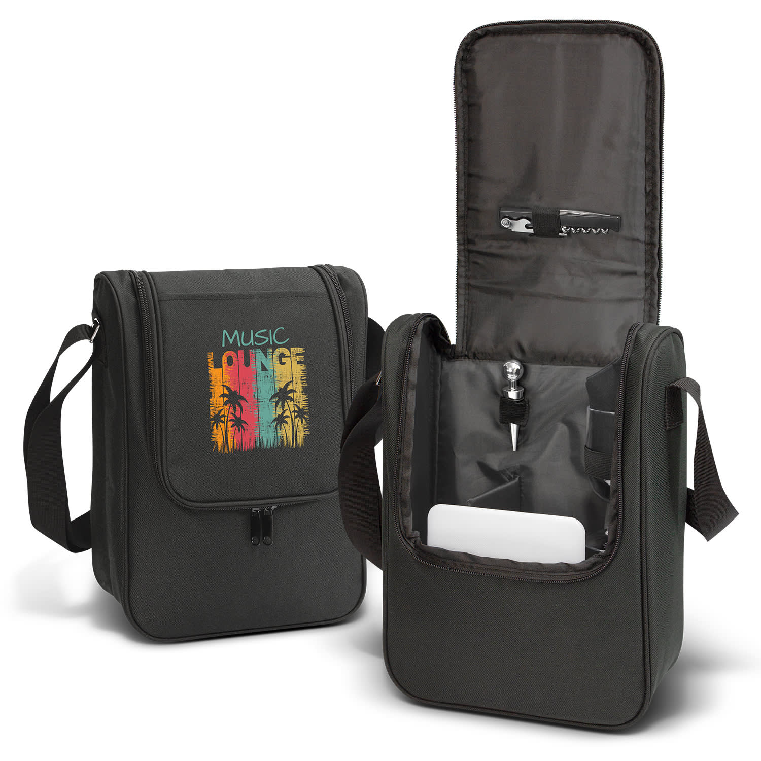 Premium picnic set which is perfect for wine and cheese connoisseurs who love the outdoors. It is manufactured from strong 600D polyester with an easy-clean lining. Bordeaux has a large zippered main compartment, an internal slip pocket, an external slip pocket and an adjustable woven shoulder strap with silver metal buckles. The picnic set includes two acrylic glasses, two black cotton napkins, a bottle opener, a wine stopper, a cheese board and room for two bottles of wine with a padded divider. Features: * Premium picnic set * Made from strong 600D polyester with an easy-clean lining * Two acrylic glasses, two black cotton napkins, a bottle opener, wine stopper, cheese board and room for two bottles of wine