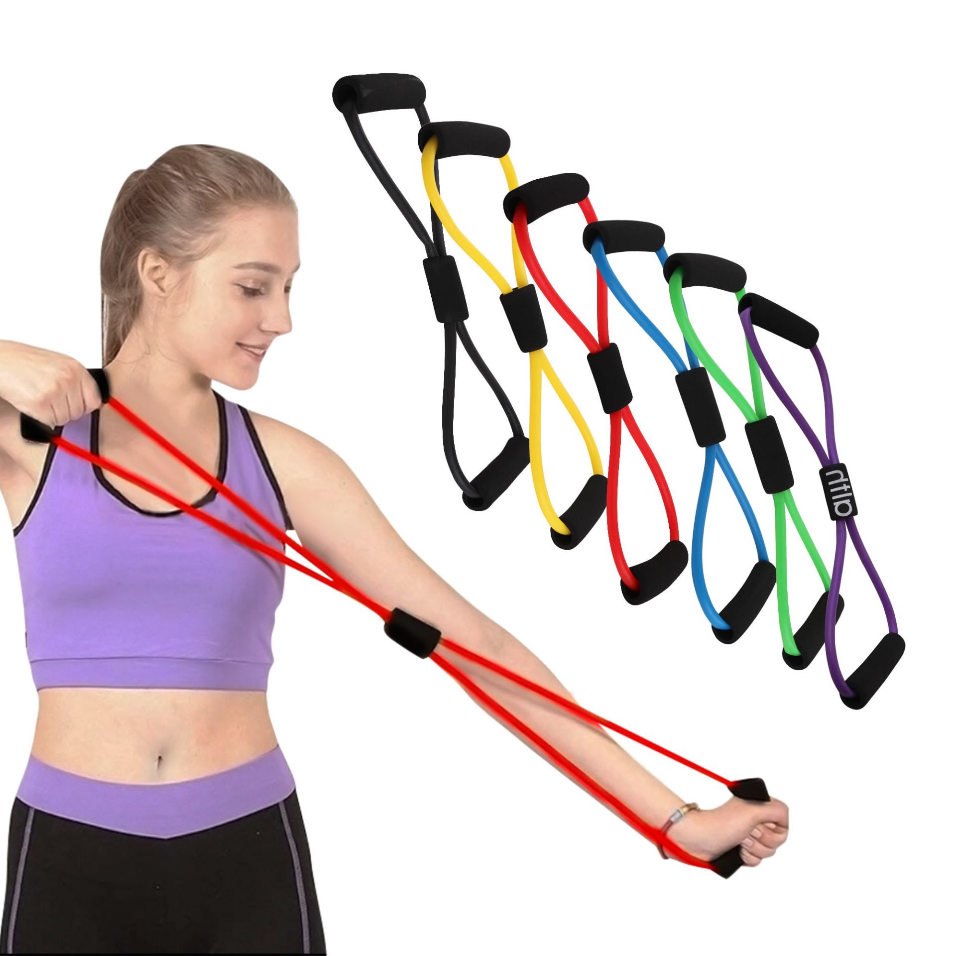 Our great resistance bands can be used to workout at home, in the gym or your office. Figure 8 bands are bands shaped in a figure 8, with handles at the top and bottom of the band. They can be used for functional exercises, particularly for the upper body. There are available in multiple colors . You can also choose to print on the belt to display your logo.