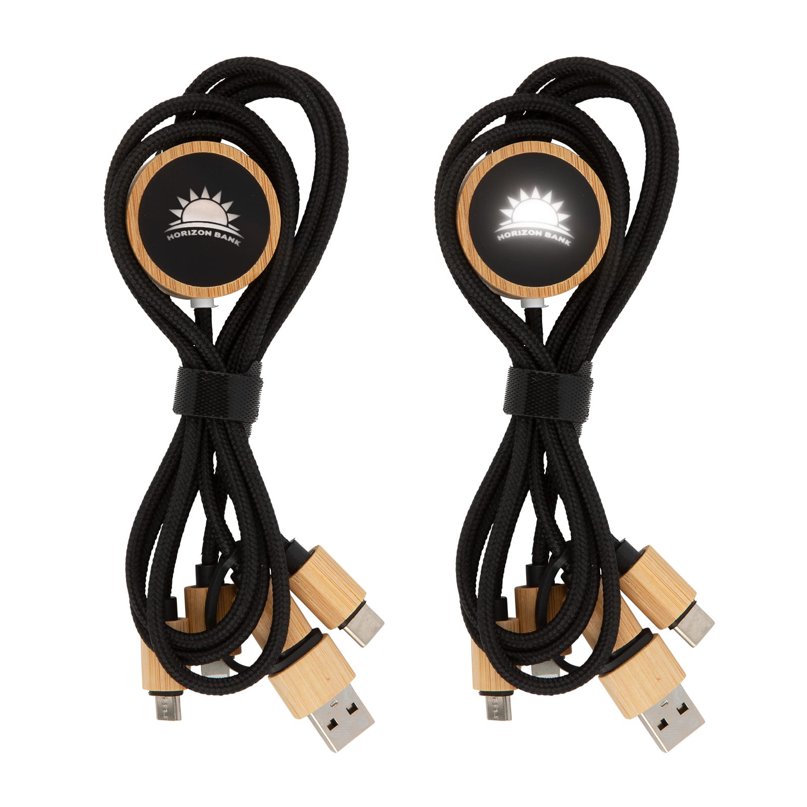 The Raven Cable – a versatile 6-in-1 woven cable designed for sleek and efficient charging. This black cable features bamboo trim on connectors, adding an eco touch to the product. The black circular top section can be lasered and will illuminate when connected, thanks to the hidden white LED light. The connectors include Combo USB A/Type C on one end and Micro USB, 8 pin, and Type C on the other, each as a separate cable, ensuring compatibility with various devices. The cable length is approximately 1.2m, and for added convenience, there's a Velcro tidy strap on each cable. Please note that the Raven Cable is designed for charging purposes only and does not support data transfer.